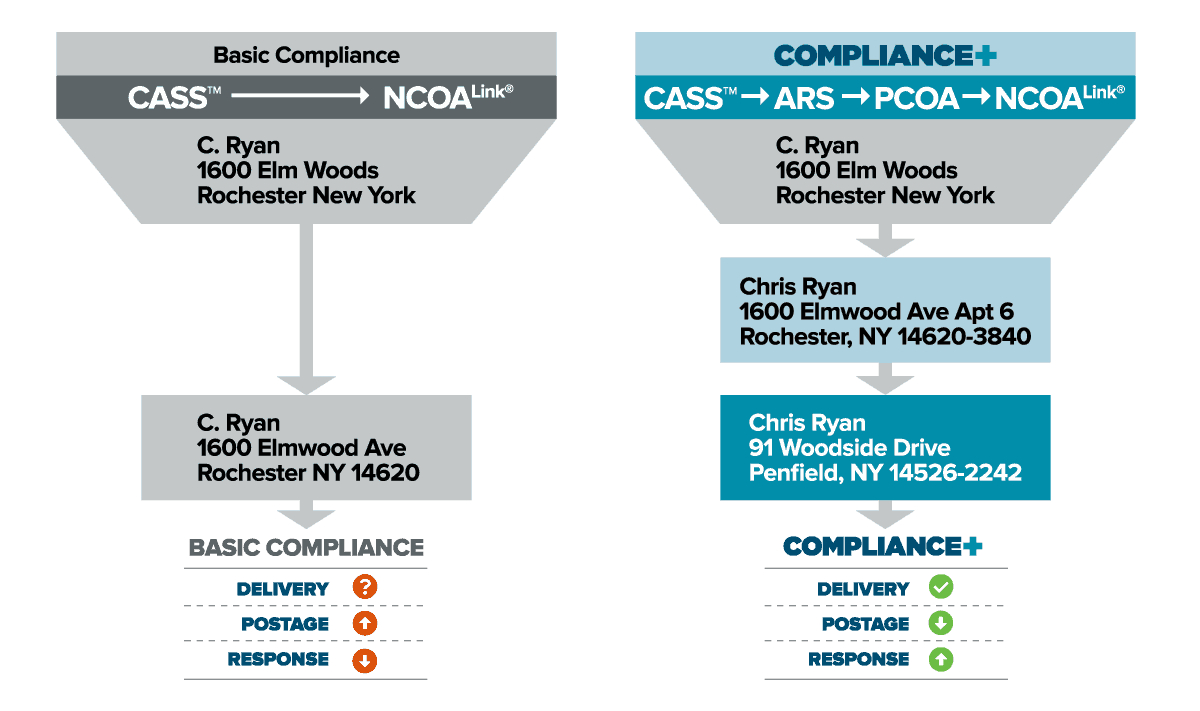 To go above and beyond traditional compliance, COMPLIANCE+™ integrates Address Resolution Service and PCOA. ARS repairs addresses that are incomplete or incorrect, turning “broken” records into usable data. PCOA identifies address changes that were not filed with the USPS®, using third-party databases to fill in the gaps left by NCOALink®.